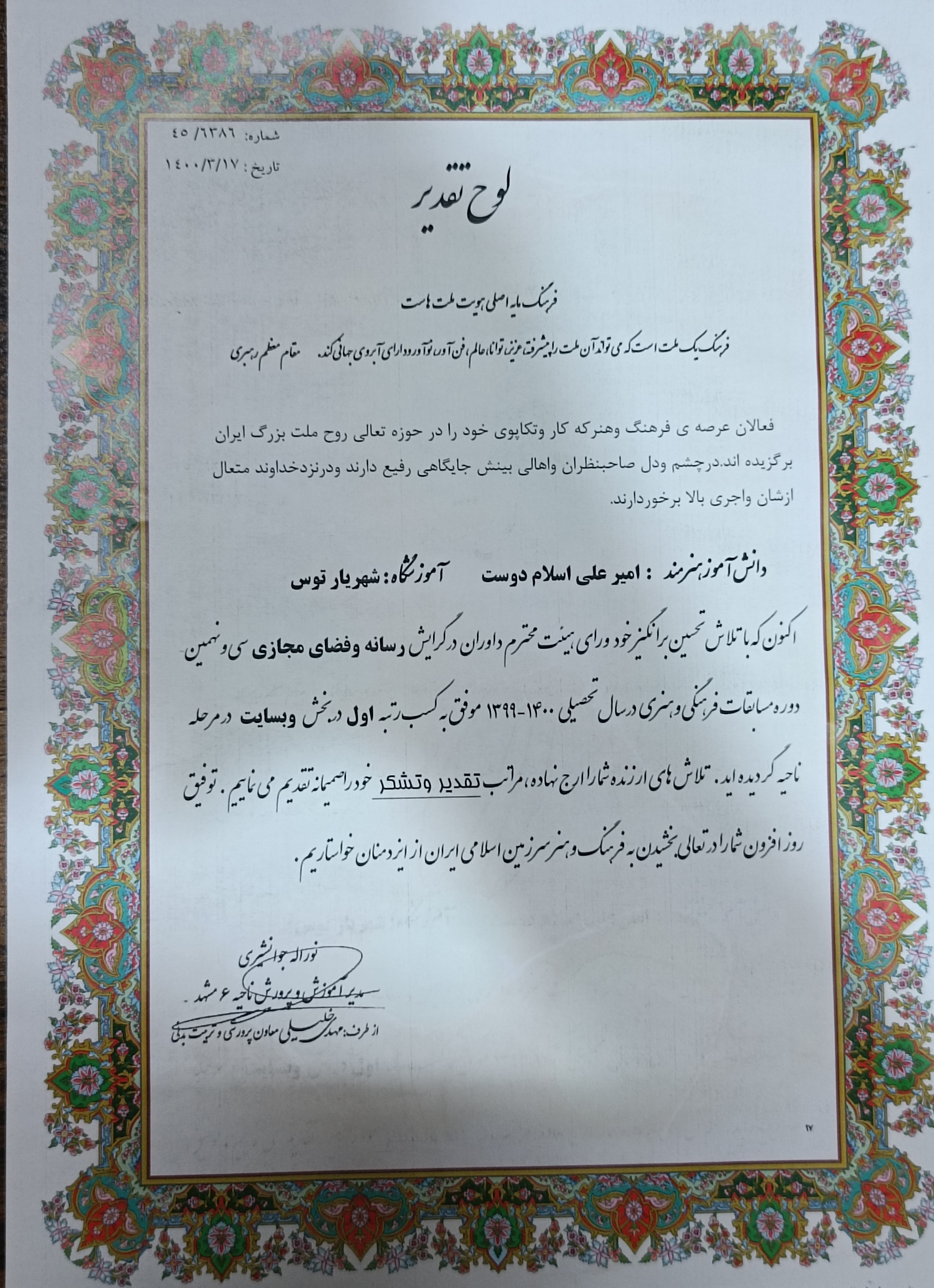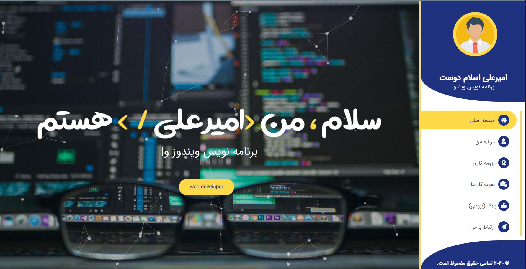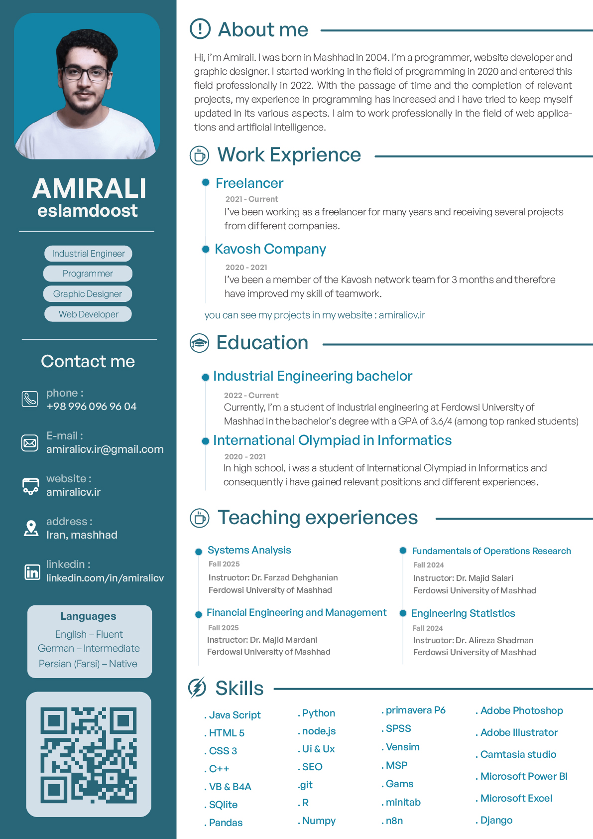 Hi, i'm Amirali. I was born in Mashhad in 2004. I'm a programmer, website developer and graphic designer. I started working in the field of programming in 2020 and entered this field professionally in 2022. With the passage of time and the completion of relevant projects, my experience in programming has increased and i have tried to keep myself updated in its various aspects. I aim to work professionally in the field of web applications and artificial intelligence.