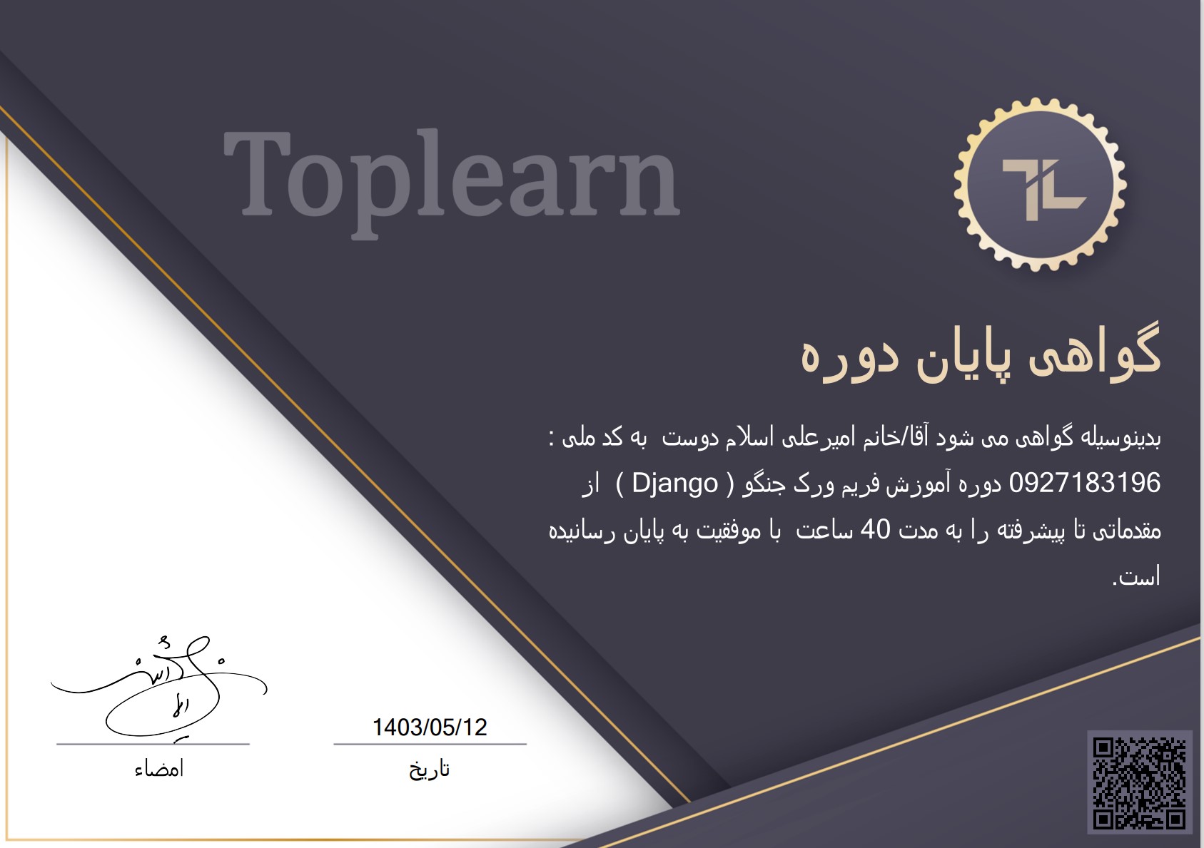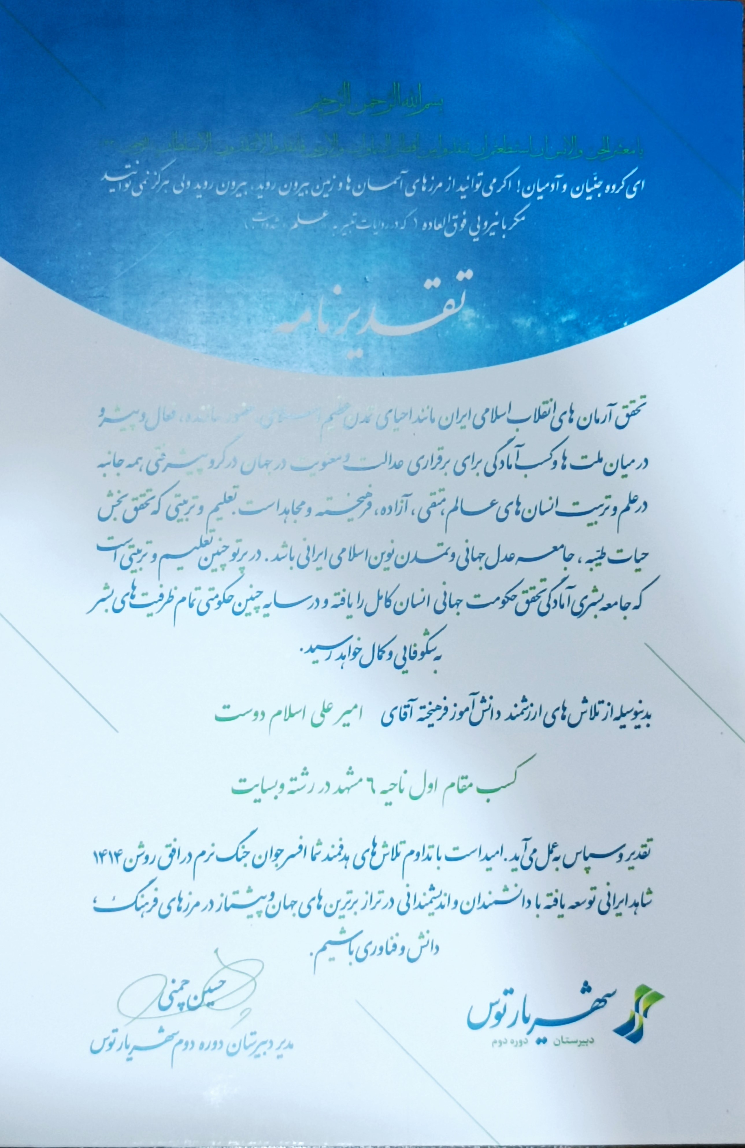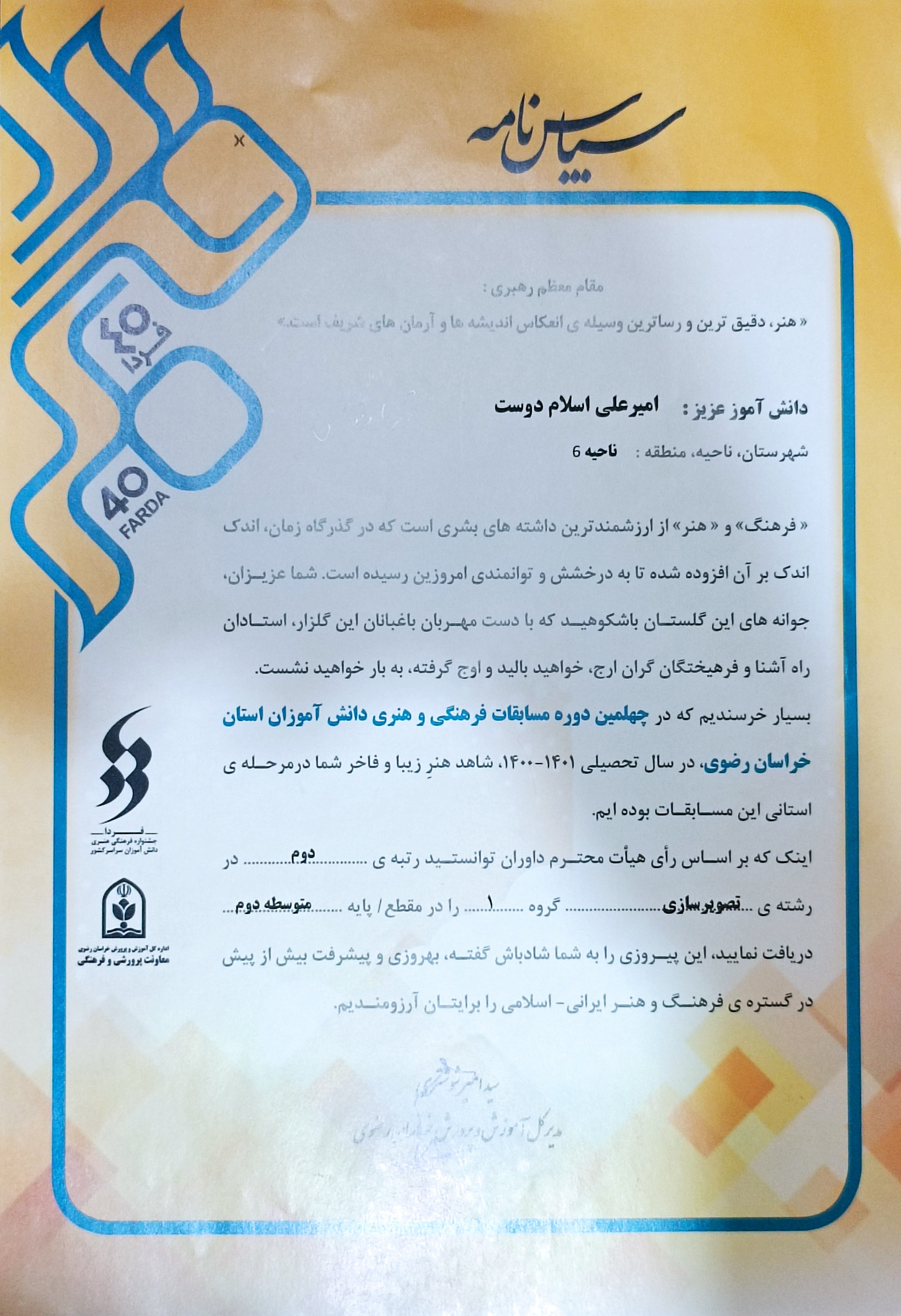 Hi, i'm Amirali. I was born in Mashhad in 2004. I'm a programmer, website developer and graphic designer. I started working in the field of programming in 2020 and entered this field professionally in 2022. With the passage of time and the completion of relevant projects, my experience in programming has increased and i have tried to keep myself updated in its various aspects. I aim to work professionally in the field of web applications and artificial intelligence.